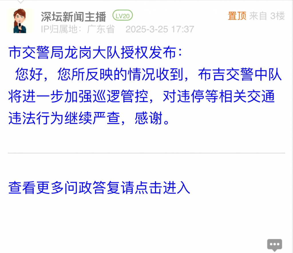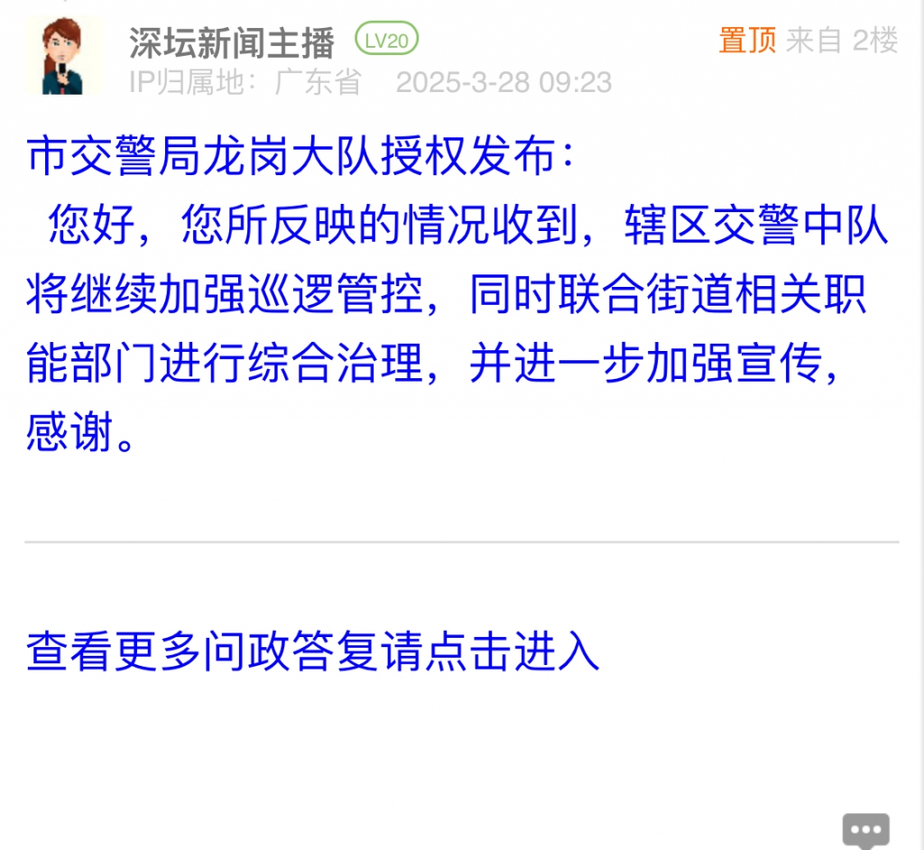 據(jù)統(tǒng)計,2025年3月24日-2025年3月30日,網(wǎng)友在深圳論壇發(fā)布問政類帖文共41篇,得到相關(guān)單位正式回應(yīng)的帖文數(shù)為38篇,本期簡報回應(yīng)速度最快的單位:市交警局寶安大隊、市交警局龍崗大隊。