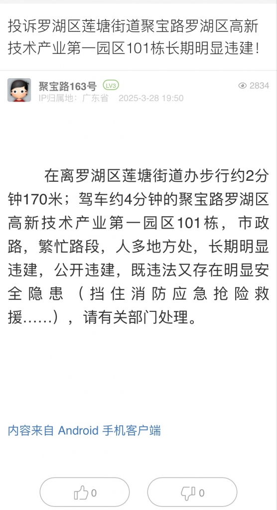 20. 帖文《投訴羅湖區(qū)蓮塘街道聚寶路羅湖區(qū)高新技術(shù)產(chǎn)業(yè)第一園區(qū)101棟長期明顯違建!》
