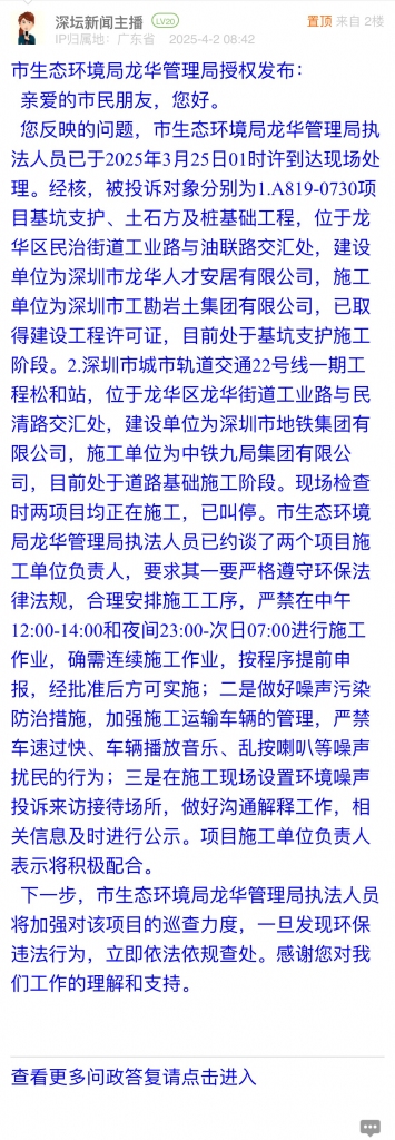 您反映的問題,市生態(tài)環(huán)境局龍華管理局執(zhí)法人員已于2025年3月25日01時許到達(dá)現(xiàn)場處理。經(jīng)核,被投訴對象分別為1.A819-0730項目基坑支護(hù)、土石方及樁基礎(chǔ)工程,位于龍華區(qū)民治街道工業(yè)路與油聯(lián)路交匯處,建設(shè)單位為深圳市龍華人才安居有限公司,施工單位為深圳市工勘巖土集團(tuán)有限公司,已取得建設(shè)工程許可證,目前處于基坑支護(hù)施工階段。2.深圳市城市軌道交通22號線一期工程松和站,位于龍華區(qū)龍華街道工業(yè)路與民清路交匯處,建設(shè)單位為深圳市地鐵集團(tuán)有限公司,施工單位為中鐵九局集團(tuán)有限公司,目前處于道路基礎(chǔ)施工階段?,F(xiàn)場檢查時兩項目均正在施工,已叫停。市生態(tài)環(huán)境局龍華管理局執(zhí)法人員已約談了兩個項目施工單位負(fù)責(zé)人,要求其一要嚴(yán)格遵守環(huán)保法律法規(guī),合理安排施工工序,嚴(yán)禁在中午12:00-14:00和夜間23:00-次日07:00進(jìn)行施工作業(yè),確需連續(xù)施工作業(yè),按程序提前申報,經(jīng)批準(zhǔn)后方可實施;二是做好噪聲污染防治措施,加強(qiáng)施工運輸車輛的管理,嚴(yán)禁車速過快、車輛播放音樂、亂按喇叭等噪聲擾民的行為;三是在施工現(xiàn)場設(shè)置環(huán)境噪聲投訴來訪接待場所,做好溝通解釋工作,相關(guān)信息及時進(jìn)行公示。項目施工單位負(fù)責(zé)人表示將積極配合。