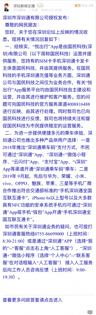 一、經(jīng)核實,“悅出行”App是由國民科技(深圳)有限公司(以下簡稱國民科技)運營并提供服務(wù),您持有的SIM卡手機(jī)深圳通卡發(fā)卡主體是國民科技,并由其提供服務(wù)。在國民科技的手機(jī)深圳通充值等業(yè)務(wù)方面,深圳通公司與國民科技之間僅為業(yè)務(wù)合作,有關(guān)“悅出行”App服務(wù)平臺均由國民科技自主建設(shè)和運營,并由其進(jìn)行維護(hù)和客戶服務(wù)。您的問題可向國民科技的官方服務(wù)渠道4008816488進(jìn)行反映,由其進(jìn)行處理。同時我司也已向國民科技進(jìn)行反饋,我司也將持續(xù)關(guān)注和督促國民科技為市民提供穩(wěn)定的運營服務(wù)。