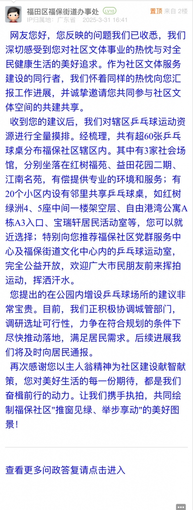 17. 帖文《關(guān)于呼吁福保社區(qū)建設(shè)一個公共乒乓球活動場地的心聲》
