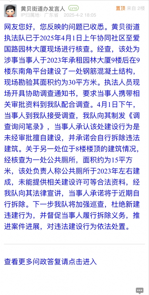 網(wǎng)友您好,您反映的問題已收悉。黃貝街道執(zhí)法隊已于2025年4月1日上午協(xié)同社區(qū)至愛國路園林大廈現(xiàn)場進(jìn)行核查。經(jīng)查,該處為涉事當(dāng)事人于2023年承租園林大廈9樓后在9樓東南角平臺建設(shè)了一處鋼筋混凝土結(jié)構(gòu),現(xiàn)場勘驗其面積約為30平方米。執(zhí)法人員現(xiàn)場開具協(xié)助調(diào)查通知書,要求當(dāng)事人攜帶相關(guān)審批資料到我隊配合調(diào)查。4月1日下午,當(dāng)事人到我隊接受調(diào)查,我隊向其制發(fā)《調(diào)查詢問筆錄》,當(dāng)事人承認(rèn)該處建設(shè)行為是未經(jīng)審批擅自建設(shè),并承諾會自行拆除違法建筑。關(guān)于另一處位于8樓樓頂?shù)慕ㄖ闆r,經(jīng)核查為一處公共廁所,面積約為15平方米,該處負(fù)責(zé)人稱公共廁所于2023年左右建成,未能提供相關(guān)建設(shè)許可等合法資料,經(jīng)我隊向其法律宣講,當(dāng)事人承諾將于近期自行拆除。下一步我隊將加強(qiáng)巡查,杜絕新建違建行為,并督促當(dāng)事人履行拆除義務(wù),推進(jìn)案件進(jìn)展,對違法建設(shè)行為依法處置。