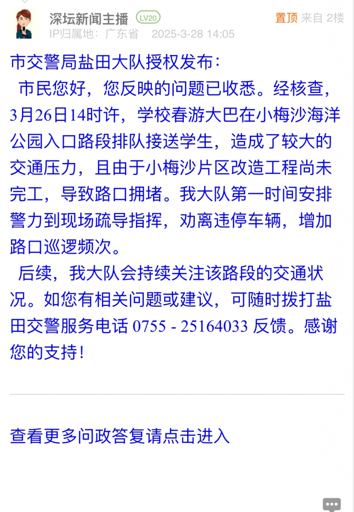 市民您好,您反映的問題已收悉。經(jīng)核查,3月26日14時許,學(xué)校春游大巴在小梅沙海洋公園入口路段排隊接送學(xué)生,造成了較大的交通壓力,且由于小梅沙片區(qū)改造工程尚未完工,導(dǎo)致路口擁堵。我大隊第一時間安排警力到現(xiàn)場疏導(dǎo)指揮,勸離違停車輛,增加路口巡邏頻次。