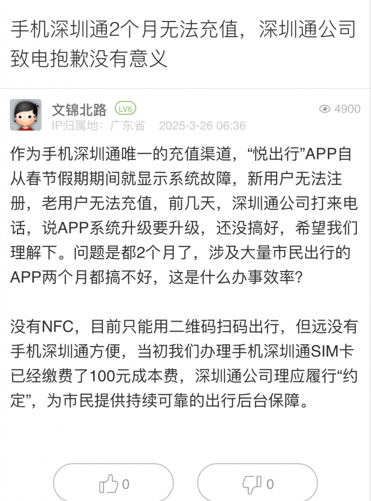 28. 帖文《手機(jī)深圳通2個月無法充值,深圳通公司致電抱歉沒有意義》