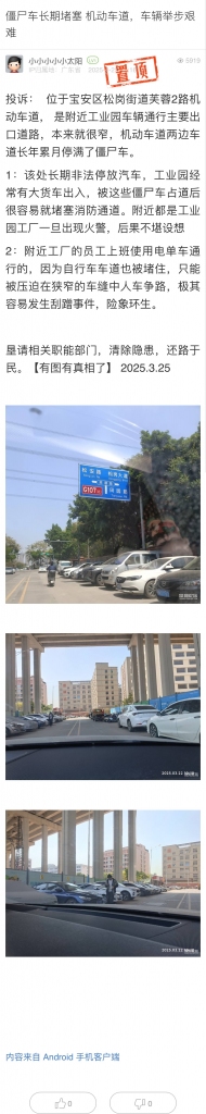 針對市民反映的松崗街道芙蓉二路違停問題,3月24日我大隊已安排警力前往此處開展違停整治工作,對路邊違停車輛勸離、查處,期間未發(fā)現(xiàn)存在“僵尸車”的情況。下一步,我大隊將持續(xù)加強(qiáng)路面巡邏,加大此類違法行為查處力度。后續(xù)如您對交通管理方面有疑問、建議、投訴的,請撥打83333333進(jìn)行反映,交警部門將立即響應(yīng),積極辦理。