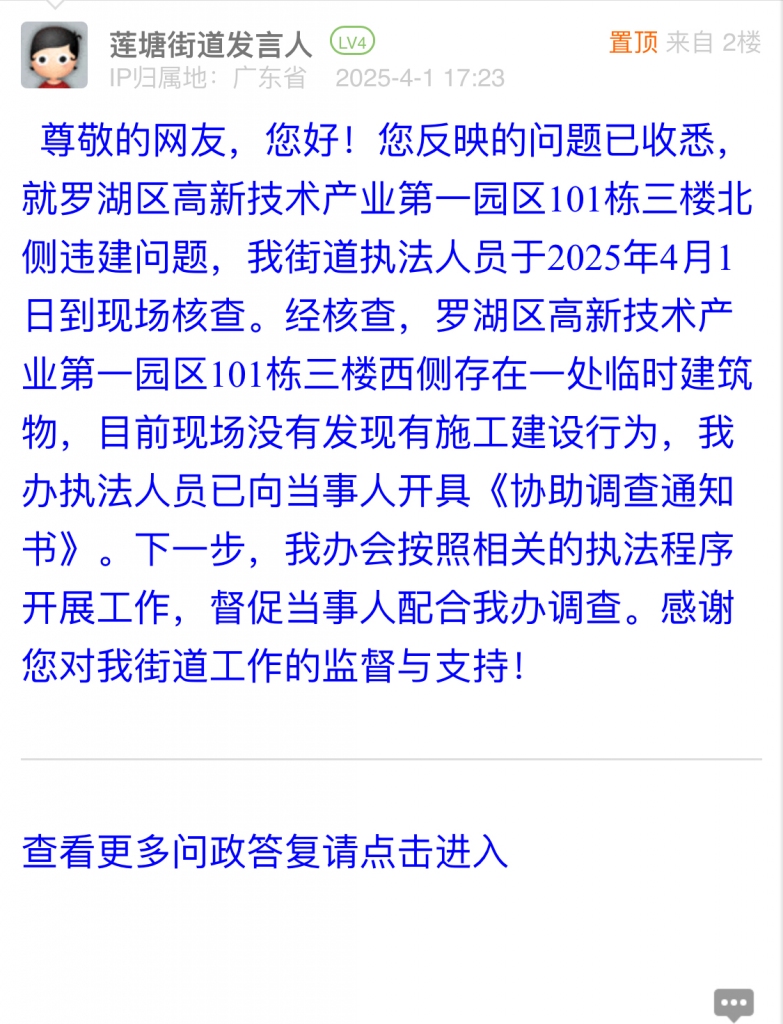 尊敬的網(wǎng)友,您好!您反映的問題已收悉,就羅湖區(qū)高新技術(shù)產(chǎn)業(yè)第一園區(qū)101棟三樓北側(cè)違建問題,我街道執(zhí)法人員于2025年4月1日到現(xiàn)場核查。經(jīng)核查,羅湖區(qū)高新技術(shù)產(chǎn)業(yè)第一園區(qū)101棟三樓西側(cè)存在一處臨時建筑物,目前現(xiàn)場沒有發(fā)現(xiàn)有施工建設(shè)行為,我街道執(zhí)法人員已向當(dāng)事人開具《協(xié)助調(diào)查通知書》。下一步,我街道會按照相關(guān)的執(zhí)法程序開展工作,督促當(dāng)事人配合我街道調(diào)查。感謝您對我街道工作的監(jiān)督與支持!
