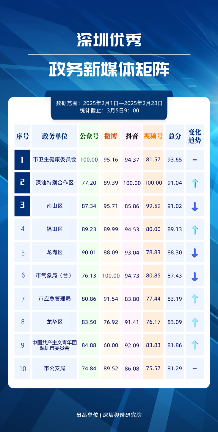 2月,市衛(wèi)生健康委、深汕特別合作區(qū)、南山區(qū)、福田區(qū)、龍崗區(qū)、市氣象局、市應(yīng)急管理局、龍華區(qū)、中國共產(chǎn)主義青年團(tuán)深圳市委員會(huì)、市公安局榮登“深圳優(yōu)秀政務(wù)新媒體矩陣”榜單。2月,市衛(wèi)生健康委賬號(hào)運(yùn)營成績亮眼,微信公眾號(hào)平臺(tái)閱讀量破10萬次的文章超60篇;深汕特別合作區(qū)新媒體矩陣緊抓網(wǎng)絡(luò)熱點(diǎn),作品吸引力顯著;南山區(qū)新媒體矩陣則持續(xù)發(fā)力宣傳,其微博號(hào)、頭條號(hào)在對(duì)應(yīng)平臺(tái)榜單中居于前二位置。以上賬號(hào)在“深圳優(yōu)秀政務(wù)新媒體矩陣”榜單中榮獲前三名。此外,福田區(qū)新媒體矩陣深耕短視頻領(lǐng)域與今日頭條平臺(tái),位于“深圳優(yōu)秀政務(wù)新媒體矩陣”第四名,彰顯出優(yōu)秀的內(nèi)容產(chǎn)出能力;龍崗區(qū)新媒體矩陣的抖音號(hào)分?jǐn)?shù)超93分,反映其在視頻制作方面的良苦用心,不斷提升內(nèi)容傳播價(jià)值;市氣象局新媒體矩陣則在微博、抖音平臺(tái)持續(xù)創(chuàng)新氣象領(lǐng)域內(nèi)容,打造“趣味科普+民生服務(wù)”雙驅(qū)模式。