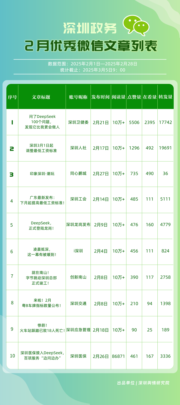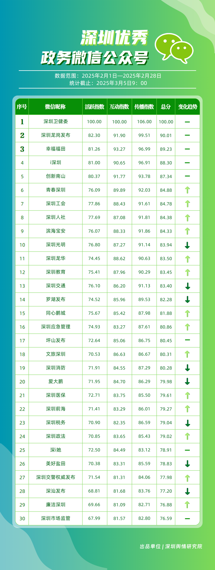 2月,“深圳衛(wèi)健委”“深圳龍崗發(fā)布”“幸福福田”“i深圳”“創(chuàng)新南山”“青春深圳”“深圳工會(huì)”“深圳人社”“濱海寶安”“深圳光明”等30個(gè)賬號(hào)入選“深圳優(yōu)秀政務(wù)微信公眾號(hào)”。其中,“深圳衛(wèi)健委”2月作品總閱讀數(shù)超600萬次,轉(zhuǎn)發(fā)超70萬次,穩(wěn)居榜單首位;“深圳龍崗發(fā)布”也在互動(dòng)、傳播方面取得較好成績,位于榜單第二位;“幸福福田”活躍度有所提升,位于榜單第三名;緊隨其后的是“i深圳”“創(chuàng)新南山”,總分均在87分以上,展現(xiàn)出各自在新媒體生態(tài)中的強(qiáng)大傳播力與影響力。