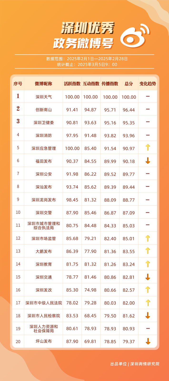 2月,“深圳天氣”“創(chuàng)新南山”“深圳衛(wèi)健委”“深圳消防”“深圳應(yīng)急管理”“福田發(fā)布”“深圳公安”“深汕發(fā)布”“深圳龍崗發(fā)布”“深圳交警”等20個(gè)賬號(hào)入選“優(yōu)秀政務(wù)微博號(hào)”。綜合看來,本月榜單前10名較上期變動(dòng)不大,反映出靠前賬號(hào)運(yùn)營發(fā)揮較穩(wěn)定。其中,“深圳天氣”在榜單中獲得第一名,該賬號(hào)與網(wǎng)民互動(dòng)積極,2月作品總點(diǎn)贊數(shù)超8萬次;“創(chuàng)新南山”“深圳衛(wèi)健委”“深圳消防”“深圳應(yīng)急管理”也各有所長,排名靠前,展現(xiàn)出深圳政務(wù)微博在形象塑造、民生服務(wù)、應(yīng)急科普等領(lǐng)域的持續(xù)影響力。