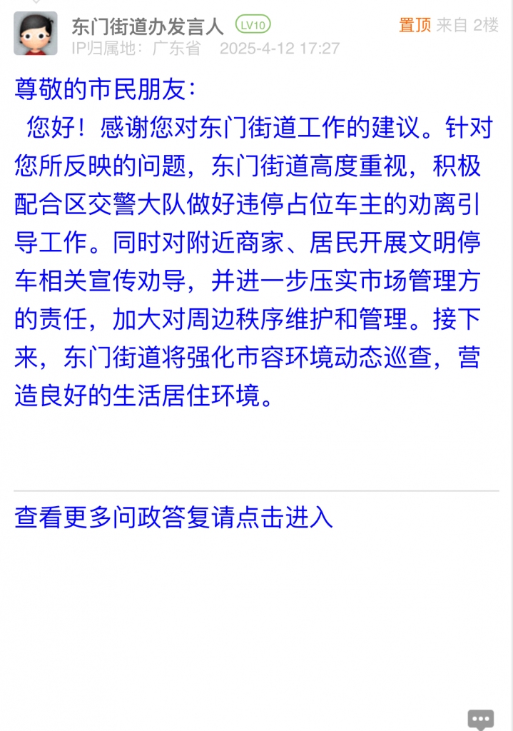 您好!感謝您對東門街道工作的建議。針對您所反映的問題,東門街道高度重視,積極配合區(qū)交警大隊做好違停占位車主的勸離引導工作。同時對附近商家、居民開展文明停車相關宣傳勸導,并進一步壓實市場管理方的責任,加大對周邊秩序維護和管理。接下來,東門街道將強化市容環(huán)境動態(tài)巡查,營造良好的生活居住環(huán)境。