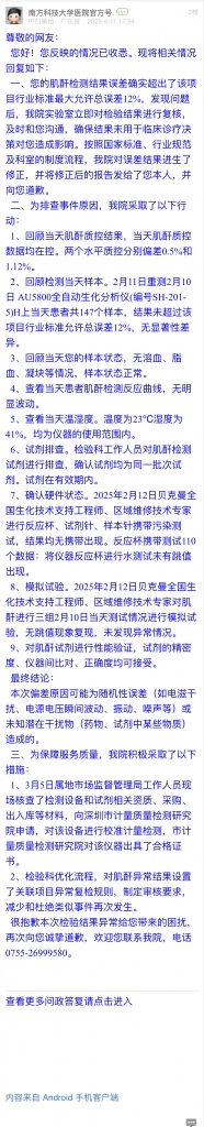 一、您的肌酐檢測結果誤差確實超出了該項目行業(yè)標準最大允許總誤差12%,發(fā)現(xiàn)問題后,我院實驗室立即對檢驗結果進行復核,及時和您溝通,確保結果未用于臨床診療決策對您造成影響。按照國家標準、行業(yè)規(guī)范及科室的制度流程,我院對誤差結果進生了修正,并將修正后的報告發(fā)給了您本人,并向您道歉。