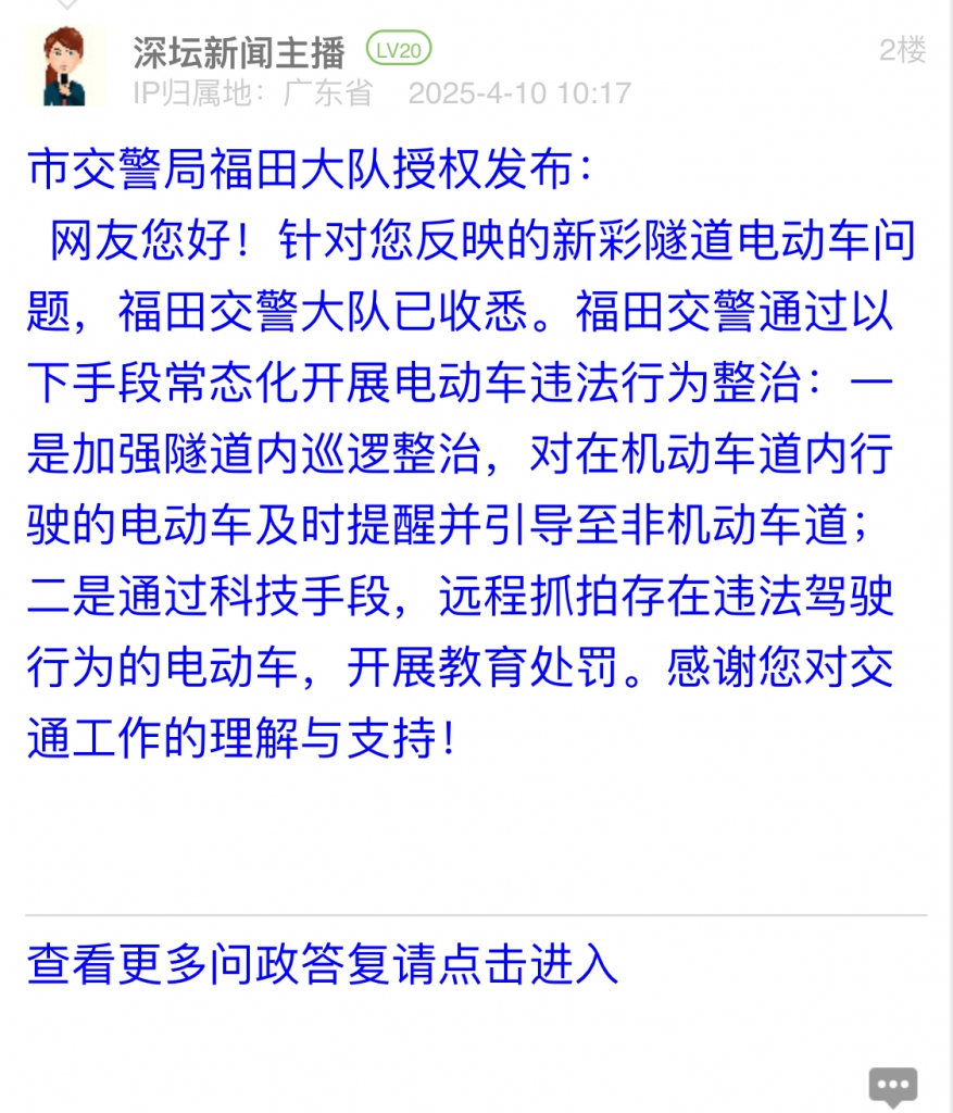 網(wǎng)友您好!針對您反映的新彩隧道電動車問題,福田交警大隊已收悉。福田交警通過以下手段常態(tài)化開展電動車違法行為整治:一是加強隧道內巡邏整治,對在機動車道內行駛的電動車及時提醒并引導至非機動車道;二是通過科技手段,遠程抓拍存在違法駕駛行為的電動車,開展教育處罰。感謝您對交通工作的理解與支持!