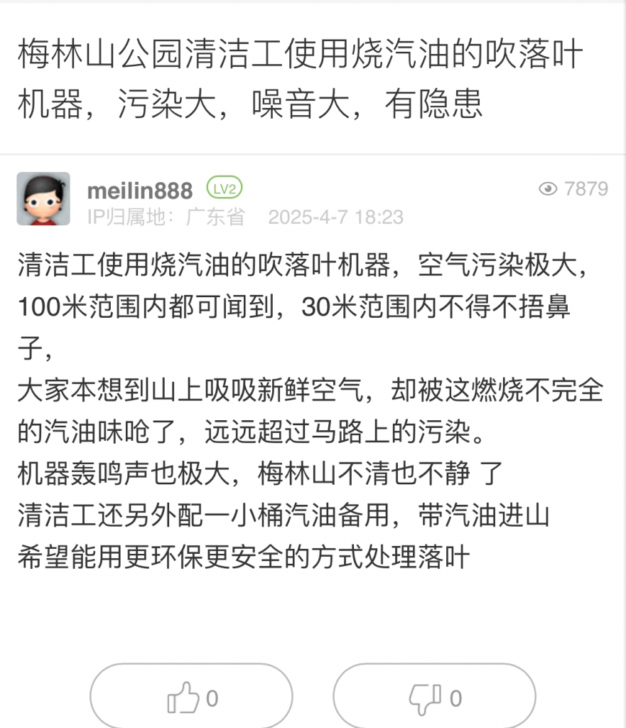 3. 帖文《梅林山公園清潔工使用燒汽油的吹落葉機器,污染大,噪音大,有隱患》