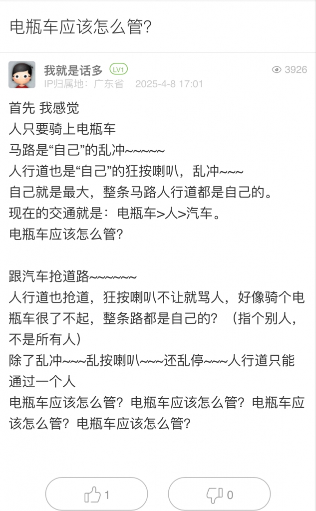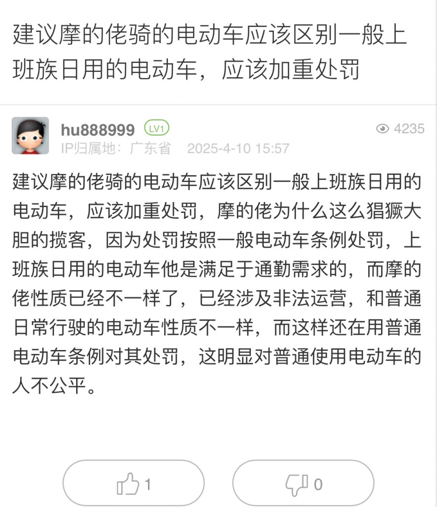 13. 帖文《建議摩的佬騎的電動車應該區(qū)別一般上班族日用的電動車,應該加重處罰》
