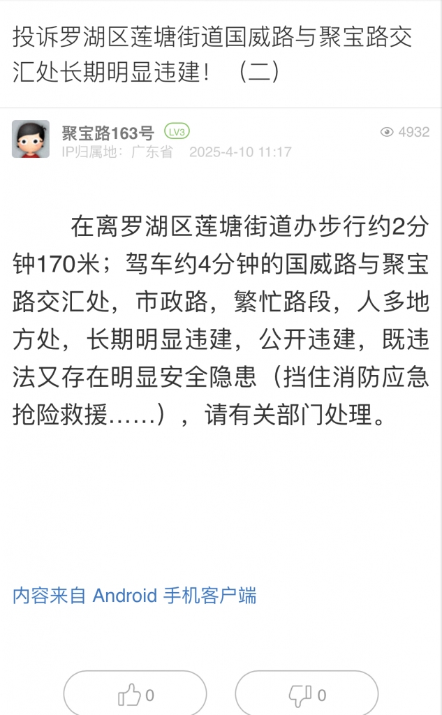 12. 帖文《投訴羅湖區(qū)蓮塘街道國威路與聚寶路交匯處長期明顯違建?。ǘ?/a>》《投訴羅湖區(qū)蓮塘街道聚寶路羅湖區(qū)高新技術產(chǎn)業(yè)第一園區(qū)101棟長期明顯違建?。ǘ?/a>》