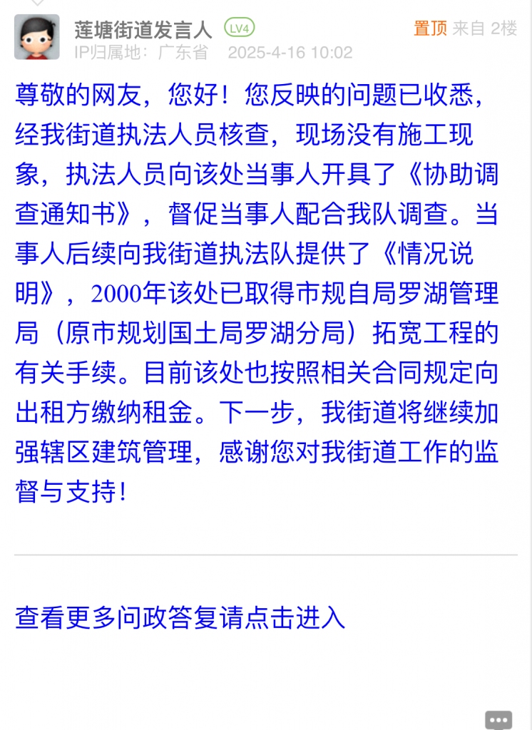 尊敬的網(wǎng)友,您好!您反映的問題已收悉,經(jīng)我街道執(zhí)法人員核查,現(xiàn)場沒有施工現(xiàn)象,執(zhí)法人員向該處當事人開具了《協(xié)助調查通知書》,督促當事人配合我隊調查。當事人后續(xù)向我街道執(zhí)法隊提供了《情況說明》,2000年該處已取得市規(guī)自局羅湖管理局(原市規(guī)劃國土局羅湖分局)拓寬工程的有關手續(xù)。目前該處也按照相關合同規(guī)定向出租方繳納租金。下一步,我街道將繼續(xù)加強轄區(qū)建筑管理,感謝您對我街道工作的監(jiān)督與支持!