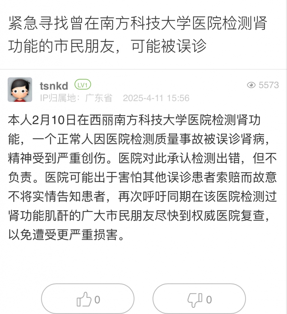 17. 帖文《緊急尋找曾在南方科技大學醫(yī)院檢測腎功能的市民朋友,可能被誤診》