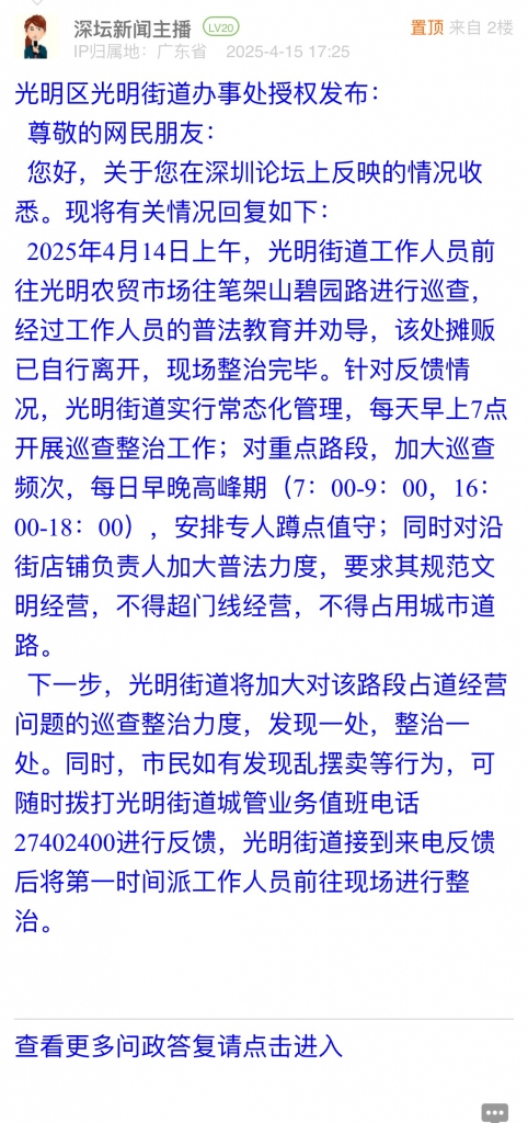 2025年4月14日上午,光明街道工作人員前往光明農貿市場往筆架山碧園路進行巡查,經(jīng)過工作人員的普法教育并勸導,該處攤販已自行離開,現(xiàn)場整治完畢。針對反饋情況,光明街道實行常態(tài)化管理,每天早上7點開展巡查整治工作;對重點路段,加大巡查頻次,每日早晚高峰期(7:00-9:00,16:00-18:00),安排專人蹲點值守;同時對沿街店鋪負責人加大普法力度,要求其規(guī)范文明經(jīng)營,不得超門線經(jīng)營,不得占用城市道路。