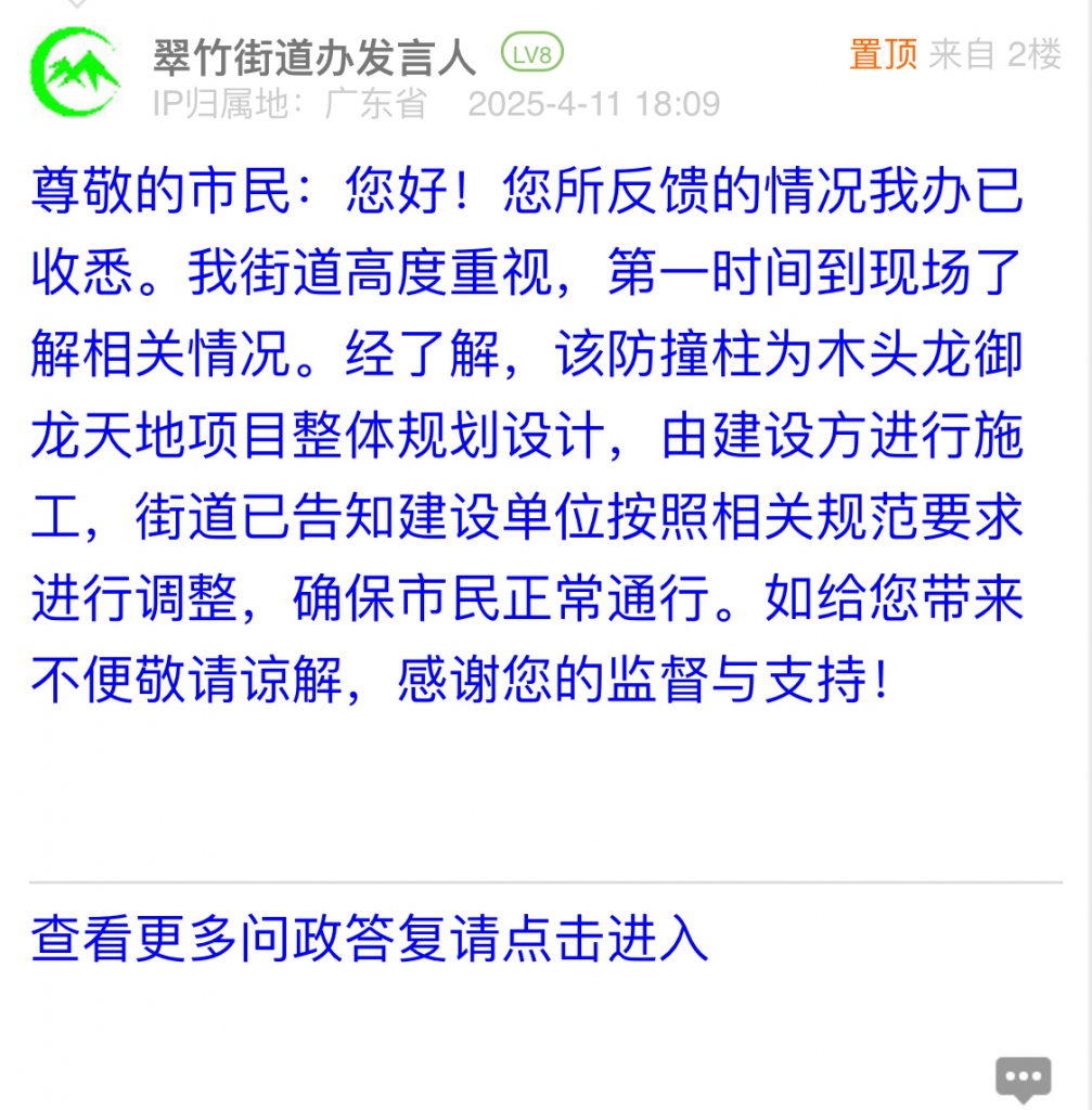 尊敬的市民:您好!您所反饋的情況我辦已收悉。我街道高度重視,第一時間到現(xiàn)場了解相關情況。經(jīng)了解,該防撞柱為木頭龍御龍?zhí)斓仨椖空w規(guī)劃設計,由建設方進行施工,街道已告知建設單位按照相關規(guī)范要求進行調整,確保市民正常通行。如給您帶來不便敬請諒解,感謝您的監(jiān)督與支持!