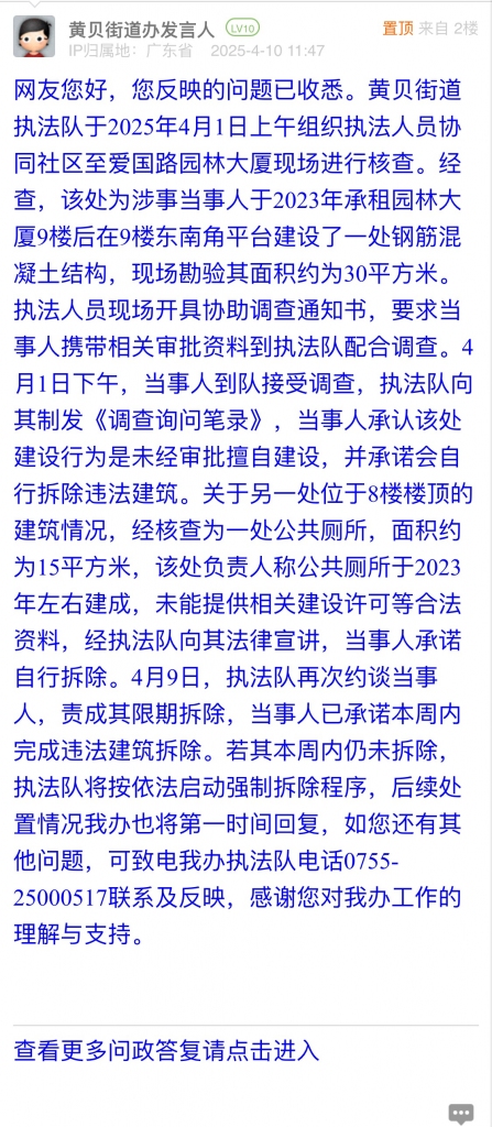 網(wǎng)友您好,您反映的問題已收悉。黃貝街道執(zhí)法隊于2025年4月1日上午組織執(zhí)法人員協(xié)同社區(qū)至愛國路園林大廈現(xiàn)場進行核查。經(jīng)查,該處為涉事當事人于2023年承租園林大廈9樓后在9樓東南角平臺建設了一處鋼筋混凝土結構,現(xiàn)場勘驗其面積約為30平方米。執(zhí)法人員現(xiàn)場開具協(xié)助調查通知書,要求當事人攜帶相關審批資料到執(zhí)法隊配合調查。4月1日下午,當事人到隊接受調查,執(zhí)法隊向其制發(fā)《調查詢問筆錄》,當事人承認該處建設行為是未經(jīng)審批擅自建設,并承諾會自行拆除違法建筑。關于另一處位于8樓樓頂?shù)慕ㄖ闆r,經(jīng)核查為一處公共廁所,面積約為15平方米,該處負責人稱公共廁所于2023年左右建成,未能提供相關建設許可等合法資料,經(jīng)執(zhí)法隊向其法律宣講,當事人承諾自行拆除。4月9日,執(zhí)法隊再次約談當事人,責成其限期拆除,當事人已承諾本周內完成違法建筑拆除。若其本周內仍未拆除,執(zhí)法隊將按依法啟動強制拆除程序,后續(xù)處置情況我辦也將第一時間回復,如您還有其他問題,可致電我辦執(zhí)法隊電話0755-25000517聯(lián)系及反映,感謝您對我辦工作的理解與支持。