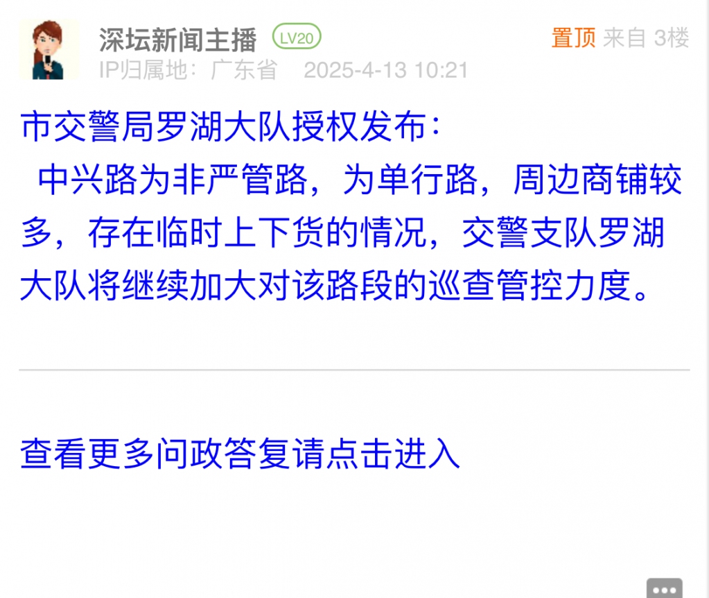 中興路為非嚴管路,為單行路,周邊商鋪較多,存在臨時上下貨的情況,交警支隊羅湖大隊將繼續(xù)加大對該路段的巡查管控力度。