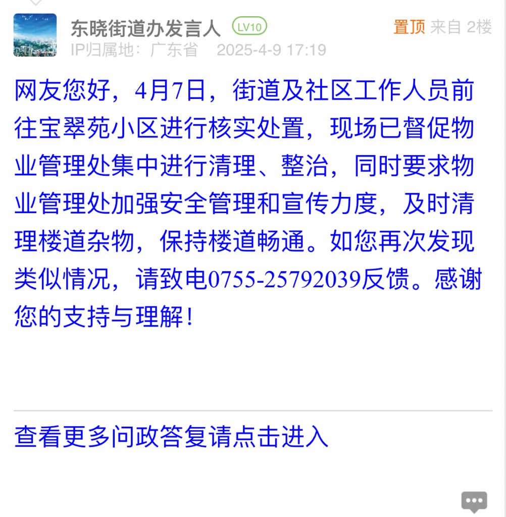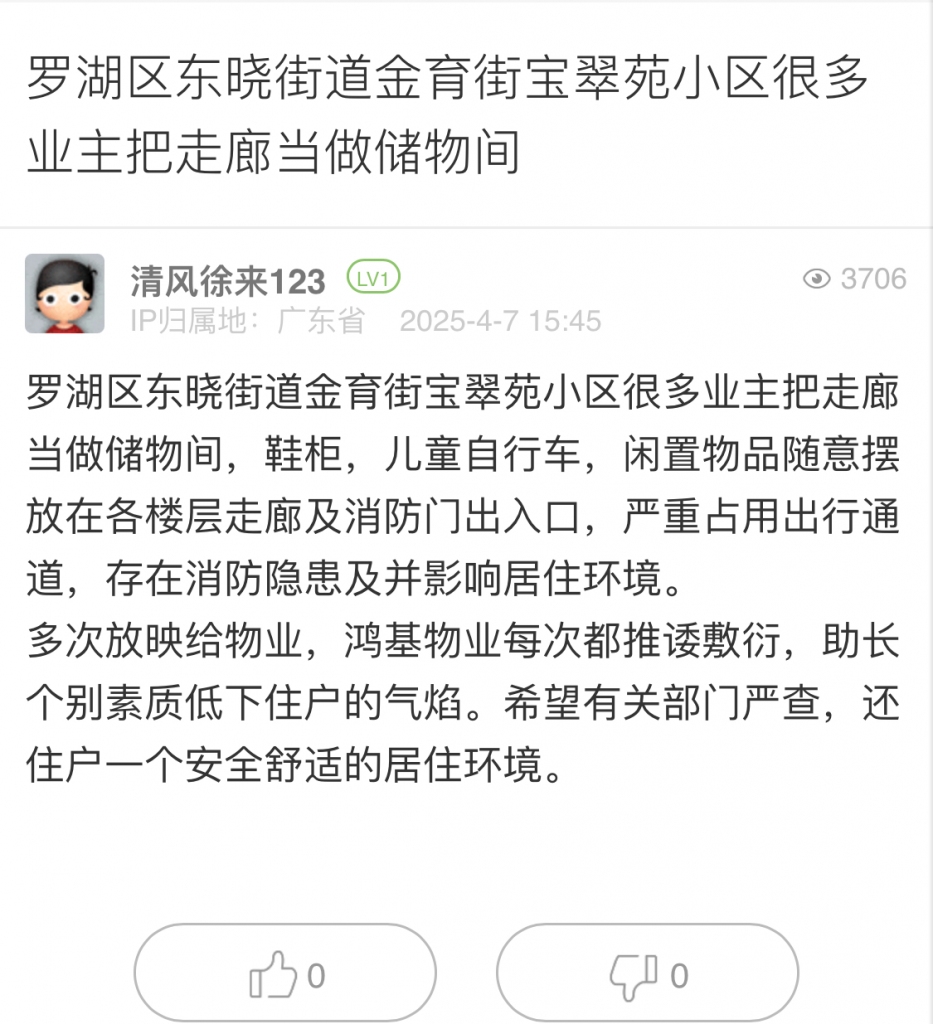 1. 帖文《羅湖區(qū)東曉街道金育街寶翠苑小區(qū)很多業(yè)主把走廊當做儲物間》