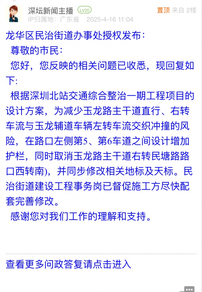 根據(jù)深圳北站交通綜合整治一期工程項目的設計方案,為減少玉龍路主干道直行、右轉車流與玉龍輔道車輛左轉車流交織沖撞的風險,在路口左側第5、第6車道之間設計增加護欄,同時取消玉龍路主干道右轉民塘路路口西轉南),并同步修改相關地標及天標。民治街道建設工程事務崗已督促施工方盡快配套完善修改。