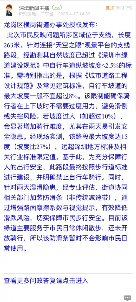 此次市民反映問題所涉區(qū)域位于支線,長度263米。針對連接“天空之眼”觀景平臺的支線路段,經(jīng)勘測其自然坡度已超過《深圳市綠道建設規(guī)范》中自行車道縱坡坡度≤2.5%的標準。需特別指出的是,根據(jù)《城市道路工程設計規(guī)范》及常見建筑標準,自行車坡道的最大坡度一般不宜超過8%。該限制能確保騎行者在上下坡時不需要過度用力,避免滑倒或失控風險;若坡度過大(如超過10%),會顯著增加騎行難度,尤其在雨天易引發(fā)安全隱患。經(jīng)現(xiàn)場實測,該路段最大坡度達15度(坡度比27%),遠超深圳地方標準及相關行業(yè)標準限定值?;诖?,為充分保障行人的出行安全,此路段最終按照步行道標準進行建設,并明確禁止自行車騎行。同時,針對雨天濕滑隱患,經(jīng)專業(yè)評估,街道協(xié)同相關部門加裝防滑條(非傳統(tǒng)減速帶),通過增強路面摩擦系數(shù)與視覺提示,有效降低滑跌風險,切實保障市民步行安全。目前該綠道主要服務于市民日常休閑散步,還未開放騎行,所以該防滑條暫時不會影響市民日常使用。