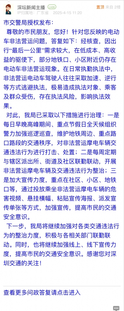 尊敬的市民朋友,您好!針對您反映的電動車非法營運問題,答復如下:經(jīng)核查,因出行“最后一公里”需求較大,在低成本、高收益的驅使下,部分地鐵口、小區(qū)附近仍存在電動車非法營運現(xiàn)象。在日常執(zhí)勤執(zhí)法中,非法營運電動車駕駛人往往采取加速、逆行等方式逃避執(zhí)法,極易造成執(zhí)法對象、乘客及群眾受傷,存在執(zhí)法風險,影響執(zhí)法效果。