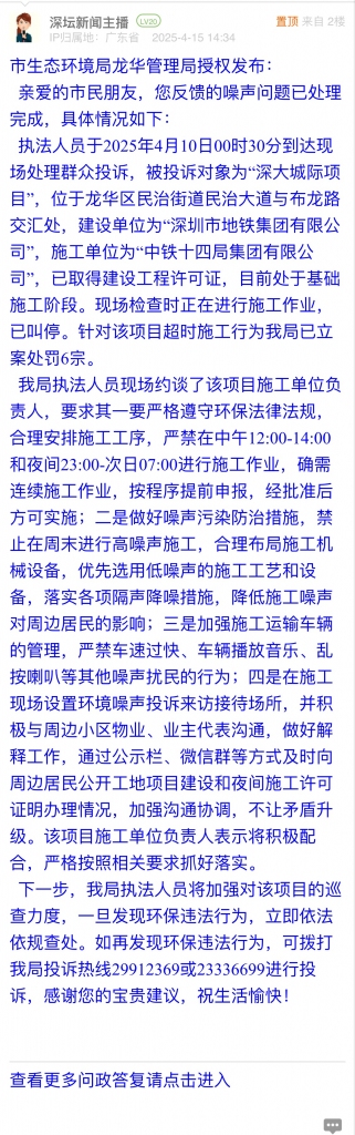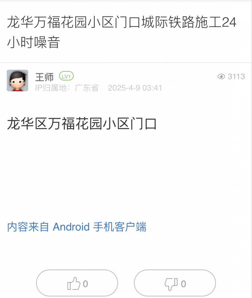 7. 帖文《龍華萬?;▓@小區(qū)門口城際鐵路施工24小時噪音》