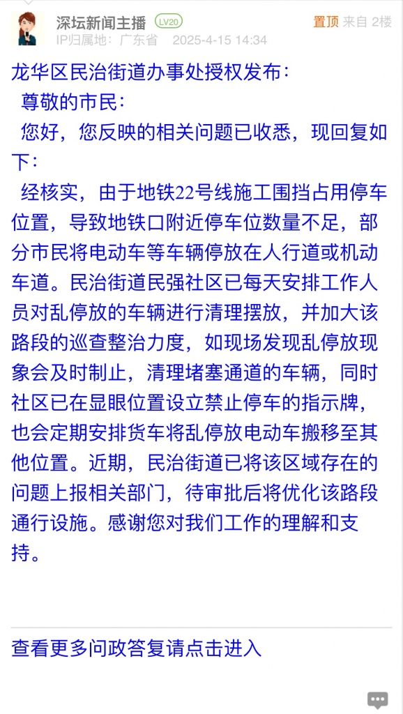 經(jīng)核實,由于地鐵22號線施工圍擋占用停車位置,導致地鐵口附近停車位數(shù)量不足,部分市民將電動車等車輛停放在人行道或機動車道。民治街道民強社區(qū)已每天安排工作人員對亂停放的車輛進行清理擺放,并加大該路段的巡查整治力度,如現(xiàn)場發(fā)現(xiàn)亂停放現(xiàn)象會及時制止,清理堵塞通道的車輛,同時社區(qū)已在顯眼位置設立禁止停車的指示牌,也會定期安排貨車將亂停放電動車搬移至其他位置。近期,民治街道已將該區(qū)域存在的問題上報相關部門,待審批后將優(yōu)化該路段通行設施。感謝您對我們工作的理解和支持。