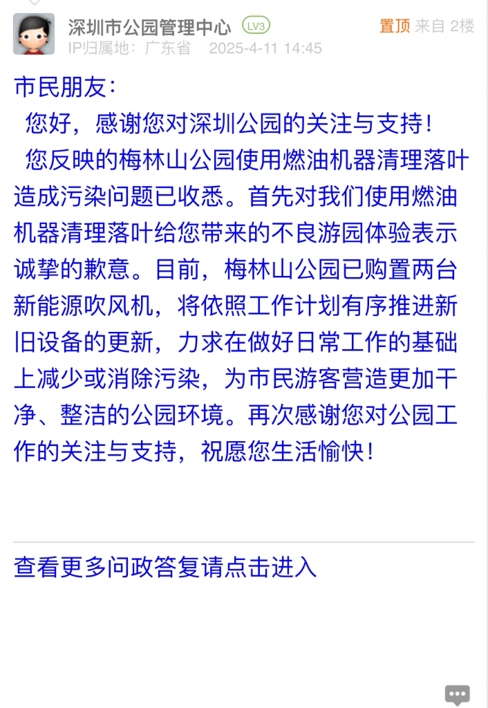您反映的梅林山公園使用燃油機器清理落葉造成污染問題已收悉。首先對我們使用燃油機器清理落葉給您帶來的不良游園體驗表示誠摯的歉意。目前,梅林山公園已購置兩臺新能源吹風機,將依照工作計劃有序推進新舊設備的更新,力求在做好日常工作的基礎上減少或消除污染,為市民游客營造更加干凈、整潔的公園環(huán)境。再次感謝您對公園工作的關注與支持,祝愿您生活愉快!