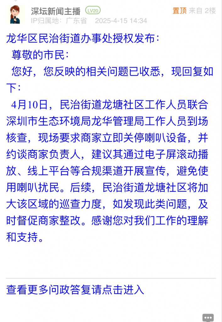 4月10日,民治街道龍?zhí)辽鐓^(qū)工作人員聯(lián)合深圳市生態(tài)環(huán)境局龍華管理局工作人員到場核查,現(xiàn)場要求商家立即關停喇叭設備,并約談商家負責人,建議其通過電子屏滾動播放、線上平臺等合規(guī)渠道開展宣傳,避免使用喇叭擾民。后續(xù),民治街道龍?zhí)辽鐓^(qū)將加大該區(qū)域的巡查力度,如發(fā)現(xiàn)此類問題,及時督促商家整改。感謝您對我們工作的理解和支持。