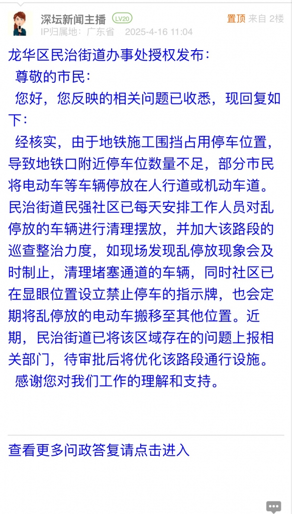 經(jīng)核實,由于地鐵施工圍擋占用停車位置,導致地鐵口附近停車位數(shù)量不足,部分市民將電動車等車輛停放在人行道或機動車道。民治街道民強社區(qū)已每天安排工作人員對亂停放的車輛進行清理擺放,并加大該路段的巡查整治力度,如現(xiàn)場發(fā)現(xiàn)亂停放現(xiàn)象會及時制止,清理堵塞通道的車輛,同時社區(qū)已在顯眼位置設立禁止停車的指示牌,也會定期將亂停放的電動車搬移至其他位置。近期,民治街道已將該區(qū)域存在的問題上報相關部門,待審批后將優(yōu)化該路段通行設施。