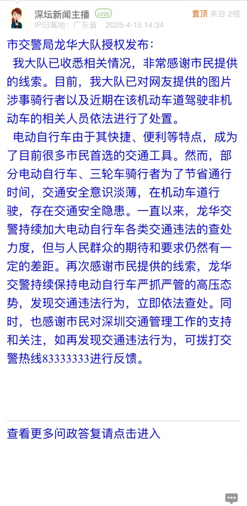 下一步,我局將繼續(xù)加強對各類交通違法行為的整治力度,積極與各相關部門聯(lián)勤聯(lián)動。同時,也將繼續(xù)加強線上、線下宣傳力度,提高市民的交通安全意識。感謝您對深圳交通的關注!