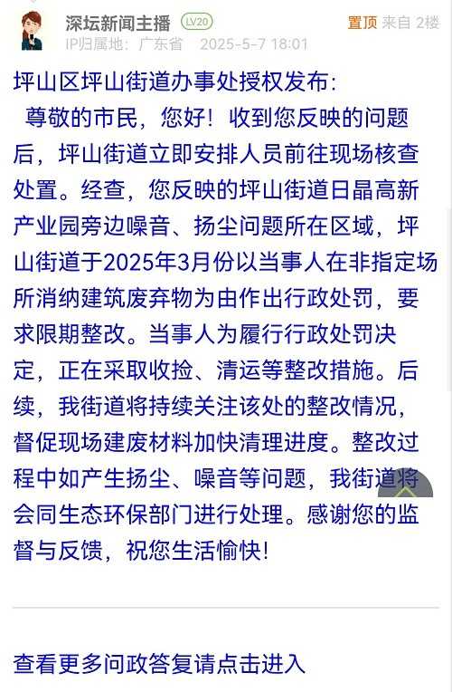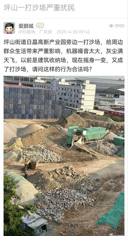 尊敬的市民,您好!收到您反映的問題后,坪山街道立即安排人員前往現(xiàn)場(chǎng)核查處置。經(jīng)查,您反映的坪山街道日晶高新產(chǎn)業(yè)園旁邊噪音、揚(yáng)塵問題所在區(qū)域,坪山街道于2025年3月份以當(dāng)事人在非指定場(chǎng)所消納建筑廢棄物為由作出行政處罰,要求限期整改。當(dāng)事人為履行行政處罰決定,正在采取收撿、清運(yùn)等整改措施。后續(xù),我街道將持續(xù)關(guān)注該處的整改情況,督促現(xiàn)場(chǎng)建廢材料加快清理進(jìn)度。整改過程中如產(chǎn)生揚(yáng)塵、噪音等問題,我街道將會(huì)同生態(tài)環(huán)保部門進(jìn)行處理。感謝您的監(jiān)督與反饋,祝您生活愉快!