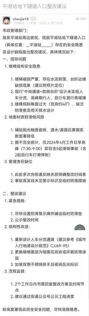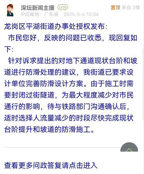 市民您好,反映的問題已收悉,現(xiàn)回復(fù)如下:針對(duì)訴求提出的對(duì)地下通道現(xiàn)狀臺(tái)階和坡道進(jìn)行防滑處理的建議,我街道已要求設(shè)計(jì)單位完善防滑設(shè)計(jì)方案。由于施工時(shí)需要封閉過街隧道,為最大程度減少對(duì)市民通行的影響,待與鐵路部門溝通確認(rèn)后,適時(shí)選擇人流量減少的時(shí)段盡快完成現(xiàn)狀臺(tái)階提升和坡道的防滑施工。