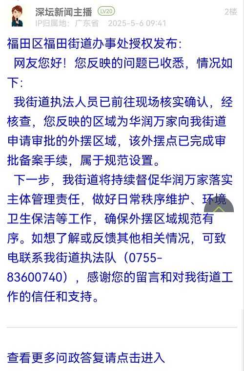 下一步,我街道將持續(xù)督促華潤(rùn)萬家落實(shí)主體管理責(zé)任,做好日常秩序維護(hù)、環(huán)境衛(wèi)生保潔等工作,確保外擺區(qū)域規(guī)范有序。如想了解或反饋其他相關(guān)情況,可致電聯(lián)系我街道執(zhí)法隊(duì)(0755-83600740),感謝您的留言和對(duì)我街道工作的信任和支持。