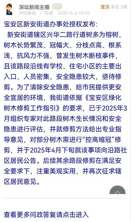 新安街道轄區(qū)興華二路行道樹多為榕樹,樹木長(zhǎng)勢(shì)繁茂、冠幅大、分枝點(diǎn)高、根系淺,抗風(fēng)力不強(qiáng),曾發(fā)生樹木斷枝事件,且該路段沿線有學(xué)校、住宅小區(qū)的主要出入口,人員密集,安全隱患較大,亟待修剪。為了清除安全隱患,給市民提供更安全宜居的環(huán)境,我街道依據(jù)《寶安區(qū)綠化樹木修剪工作指引》的要求,已于2025年3月組織專家對(duì)此路段樹木生長(zhǎng)情況和安全隱患進(jìn)行評(píng)估,并就修剪方法給出專業(yè)指導(dǎo)意見,對(duì)部分樹木需進(jìn)行“控高縮冠”修剪,并于2025年4月下旬就該事項(xiàng)向沿路社區(qū)居民公告。后續(xù)其余路段修剪在滿足安全要求下,注重美觀實(shí)用,并再次征求轄區(qū)居民意見。