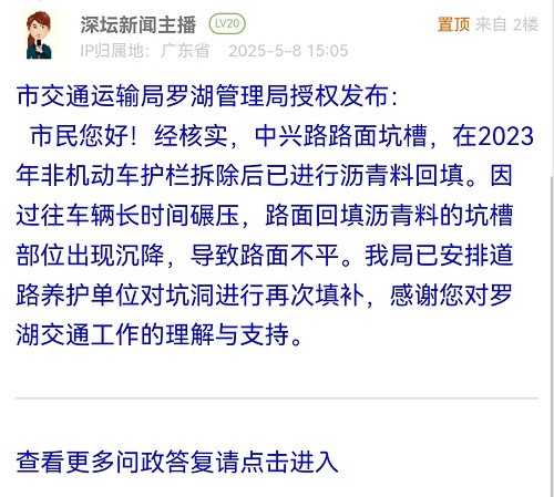 市民您好!經(jīng)核實(shí),中興路路面坑槽,在2023年非機(jī)動(dòng)車護(hù)欄拆除后已進(jìn)行瀝青料回填。因過往車輛長(zhǎng)時(shí)間碾壓,路面回填瀝青料的坑槽部位出現(xiàn)沉降,導(dǎo)致路面不平。我局已安排道路養(yǎng)護(hù)單位對(duì)坑洞進(jìn)行再次填補(bǔ),感謝您對(duì)羅湖交通工作的理解與支持。