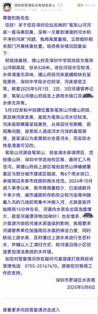 您好!關(guān)于您在深圳論壇反映的“筆架山河河底一直烏黑犯臭,沒有一天看到清澈的河水和干凈的河床”問題,我局高度重視,立即組織相關(guān)部門開展核查處置?,F(xiàn)將有關(guān)情況回復(fù)如下: