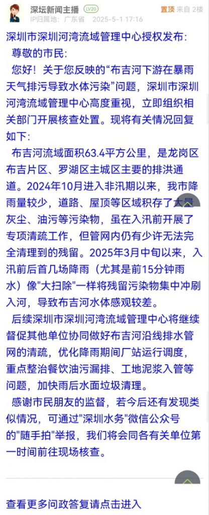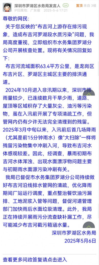 我局已督促市水務(wù)集團(tuán)羅湖分公司持續(xù)做好布吉河沿線排水管網(wǎng)的清疏,優(yōu)化降雨期間廠站運(yùn)行調(diào)度,重點(diǎn)整治餐飲油污漏排、工地泥漿入管等問題,督促河道管理部門加快雨后水面垃圾清理。此外,我局正在持續(xù)開展雨污分流查缺補(bǔ)漏工作,盡可能減少布吉河截污箱涵水量。