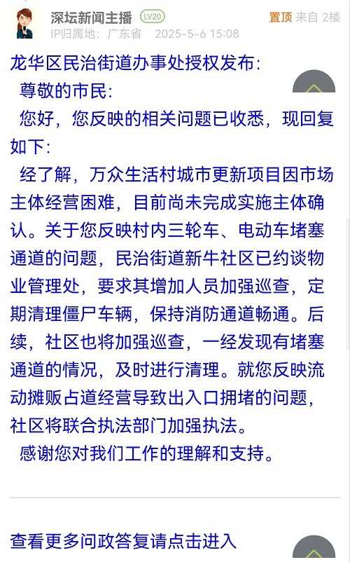 尊敬的市民:您好,您反映的相關(guān)問題已收悉,現(xiàn)回復(fù)如下:經(jīng)了解,萬眾生活村城市更新項(xiàng)目因市場(chǎng)主體經(jīng)營(yíng)困難,目前尚未完成實(shí)施主體確認(rèn)。關(guān)于您反映村內(nèi)三輪車、電動(dòng)車堵塞通道的問題,民治街道新牛社區(qū)已約談物業(yè)管理處,要求其增加人員加強(qiáng)巡查,定期清理僵尸車輛,保持消防通道暢通。后續(xù),社區(qū)也將加強(qiáng)巡查,一經(jīng)發(fā)現(xiàn)有堵塞通道的情況,及時(shí)進(jìn)行清理。就您反映流動(dòng)攤販占道經(jīng)營(yíng)導(dǎo)致出入口擁堵的問題,社區(qū)將聯(lián)合執(zhí)法部門加強(qiáng)執(zhí)法。感謝您對(duì)我們工作的理解和支持。