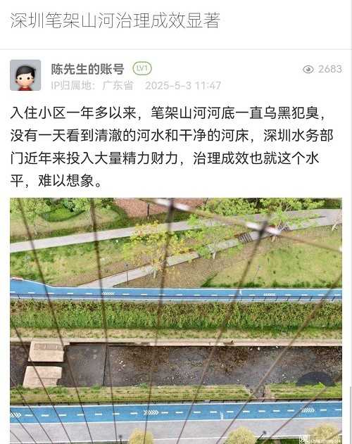 經(jīng)現(xiàn)場(chǎng)復(fù)核,縉山府及深圳中學(xué)坭崗段為筆架山河明渠段,總長(zhǎng)528米。該處河段水位較淺,水體清澈無異味,縉山府段河床底鋪砌塊石呈現(xiàn)黑色,深圳中學(xué)段水位較深,河床感官正常。核查2025年5月1日、2日、3日河道管養(yǎng)記錄,筆架山河縉山府段及上游雨水排口及河道水體無異常。