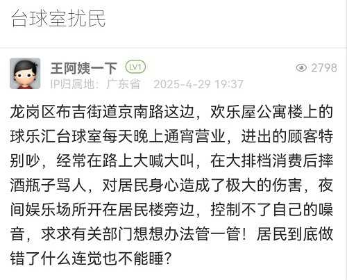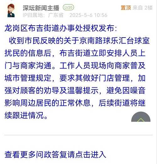 收到市民反映的關(guān)于京南路球樂匯臺(tái)球室擾民的信息后,布吉街道立即安排人員上門與商家溝通。工作人員現(xiàn)場(chǎng)向商家普及城市管理規(guī)定,要求其做好門店管理,加強(qiáng)對(duì)顧客的勸導(dǎo)及溫馨提示,避免因噪音影響周邊居民的正常休息,后續(xù)街道將繼續(xù)跟進(jìn)情況。