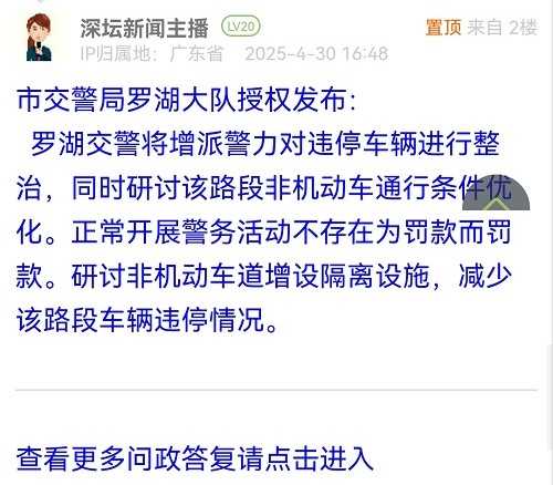 羅湖交警將增派警力對(duì)違停車輛進(jìn)行整治,同時(shí)研討該路段非機(jī)動(dòng)車通行條件優(yōu)化。正常開展警務(wù)活動(dòng)不存在為罰款而罰款。研討非機(jī)動(dòng)車道增設(shè)隔離設(shè)施,減少該路段車輛違停情況。