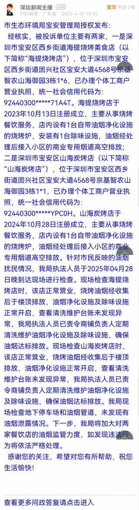 經(jīng)核實(shí),被投訴單位主要有兩家,一是深圳市寶安區(qū)西鄉(xiāng)街道海提燒烤美食店(以下簡(jiǎn)稱“海提燒烤店”),位于深圳市寶安區(qū)西鄉(xiāng)街道固興社區(qū)寶安大道4568號(hào)京基智農(nóng)山海御園3棟1*6,已辦理個(gè)體工商戶營(yíng)業(yè)執(zhí)照,統(tǒng)一社會(huì)信用代碼為:92440300*****71A4T。海提燒烤店于2023年10月13日注冊(cè)成立,主要從事燒烤餐飲服務(wù),店內(nèi)設(shè)有1臺(tái)自帶油煙凈化設(shè)施的燒烤爐,安裝有1臺(tái)除味設(shè)施,油煙經(jīng)處理后接入小區(qū)的商業(yè)專用煙道高空排放;二是深圳市寶安區(qū)山海炭烤店(以下簡(jiǎn)稱“山海炭烤店”),位于深圳市寶安區(qū)西鄉(xiāng)街道固興社區(qū)寶安大道4568號(hào)京基智農(nóng)山海御園3棟1*1,已辦理個(gè)體工商戶營(yíng)業(yè)執(zhí)照,統(tǒng)一社會(huì)信用代碼為:92440300*****YPC0H。山海炭烤店于2024年10月28日注冊(cè)成立,主要從事燒烤餐飲服務(wù),店內(nèi)設(shè)有1臺(tái)自帶油煙凈化設(shè)施的燒烤爐,油煙經(jīng)處理后接入小區(qū)的商業(yè)專用煙道高空排放。針對(duì)市民反映的油煙擾民情況,我局執(zhí)法人員于2025年04月28日晚到達(dá)現(xiàn)場(chǎng)進(jìn)行檢查。現(xiàn)場(chǎng)檢查海提燒烤店時(shí),該店正常營(yíng)業(yè),燒烤油煙經(jīng)收集后于樓頂排放,油煙凈化設(shè)施及除味設(shè)施正常開啟,查看清洗維護(hù)臺(tái)賬未發(fā)現(xiàn)異常,我局執(zhí)法人員已責(zé)令商鋪負(fù)責(zé)人定期清洗維護(hù)油煙凈化設(shè)施及除味設(shè)施,確保油煙達(dá)標(biāo)排放?,F(xiàn)場(chǎng)檢查山海炭烤店時(shí),該店正常營(yíng)業(yè),燒烤油煙經(jīng)收集后于樓頂排放,油煙凈化設(shè)施正常開啟,查看清洗維護(hù)臺(tái)賬未發(fā)現(xiàn)異常,我局執(zhí)法人員已責(zé)令商鋪負(fù)責(zé)人定期清洗維護(hù)油煙凈化設(shè)施及除味設(shè)施,確保油煙達(dá)標(biāo)排放。我局現(xiàn)場(chǎng)檢查地下停車場(chǎng)和油煙管道,未發(fā)現(xiàn)有油煙泄露情況。下一步,我局將加大對(duì)兩家餐飲店的油煙監(jiān)管力度,如發(fā)現(xiàn)違法行為將依法嚴(yán)格處理。感謝您的關(guān)注,希望對(duì)您有所幫助,祝您生活愉快!