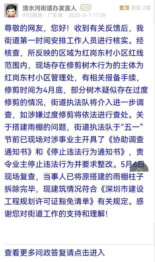 尊敬的網(wǎng)友,您好!收到有關(guān)反饋后,我街道第一時(shí)間安排工作人員進(jìn)行核實(shí)。經(jīng)核查,所反映的區(qū)域?yàn)榧t崗東村小區(qū)紅線范圍內(nèi),現(xiàn)場(chǎng)存在修剪樹木行為的主體為紅崗東村小區(qū)管理處,有相關(guān)報(bào)備手續(xù),修剪時(shí)間為4月底,部分樹木疑似存在過度修剪的情況,街道執(zhí)法隊(duì)將介入進(jìn)一步調(diào)查,如涉嫌過度修剪將依法進(jìn)行查處。關(guān)于搭建雨棚的問題,街道執(zhí)法隊(duì)于“五一”節(jié)前已現(xiàn)場(chǎng)對(duì)涉事業(yè)主開具了《協(xié)助調(diào)查通知書》和《停止違法行為通知書》,責(zé)令業(yè)主停止違法行為并要求整改。5月6日現(xiàn)場(chǎng)復(fù)查,當(dāng)事人已將原搭建的雨棚柱子拆除完畢,現(xiàn)建筑情況符合《深圳市建設(shè)工程規(guī)劃許可證豁免清單》有關(guān)規(guī)定。感謝您對(duì)街道工作的支持和理解!