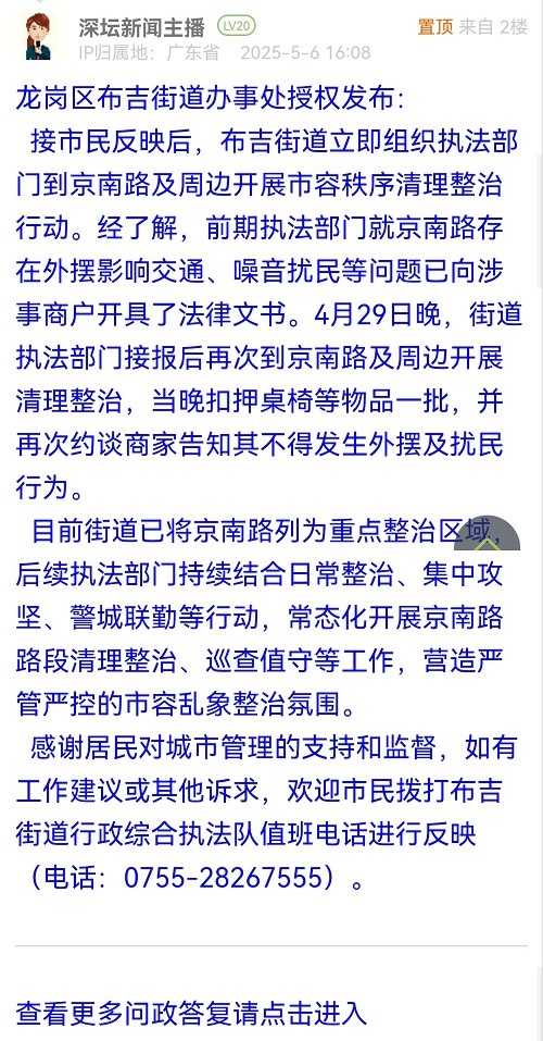 接市民反映后,布吉街道立即組織執(zhí)法部門到京南路及周邊開展市容秩序清理整治行動(dòng)。經(jīng)了解,前期執(zhí)法部門就京南路存在外擺影響交通、噪音擾民等問題已向涉事商戶開具了法律文書。4月29日晚,街道執(zhí)法部門接報(bào)后再次到京南路及周邊開展清理整治,當(dāng)晚扣押桌椅等物品一批,并再次約談商家告知其不得發(fā)生外擺及擾民行為。