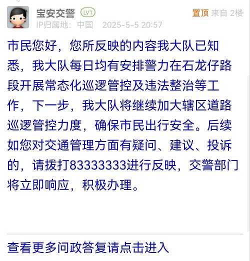 市民您好,您所反映的內(nèi)容我大隊(duì)已知悉,我大隊(duì)每日均有安排警力在石龍仔路段開展常態(tài)化巡邏管控及違法整治等工作,下一步,我大隊(duì)將繼續(xù)加大轄區(qū)道路巡邏管控力度,確保市民出行安全。后續(xù)如您對(duì)交通管理方面有疑問、建議、投訴的,請(qǐng)撥打83333333進(jìn)行反映,交警部門將立即響應(yīng),積極辦理。